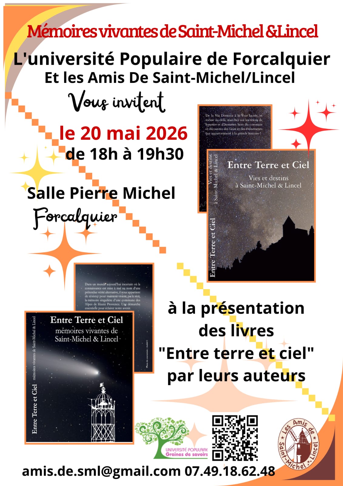 Le 20 mai à 18h, les auteurs du Livre « Entre Terre et Ciel » animeront une conférence collective en partenariat avec L’Université Populaire de Forcalquier, salle Pierre Michel à Forcalquier.